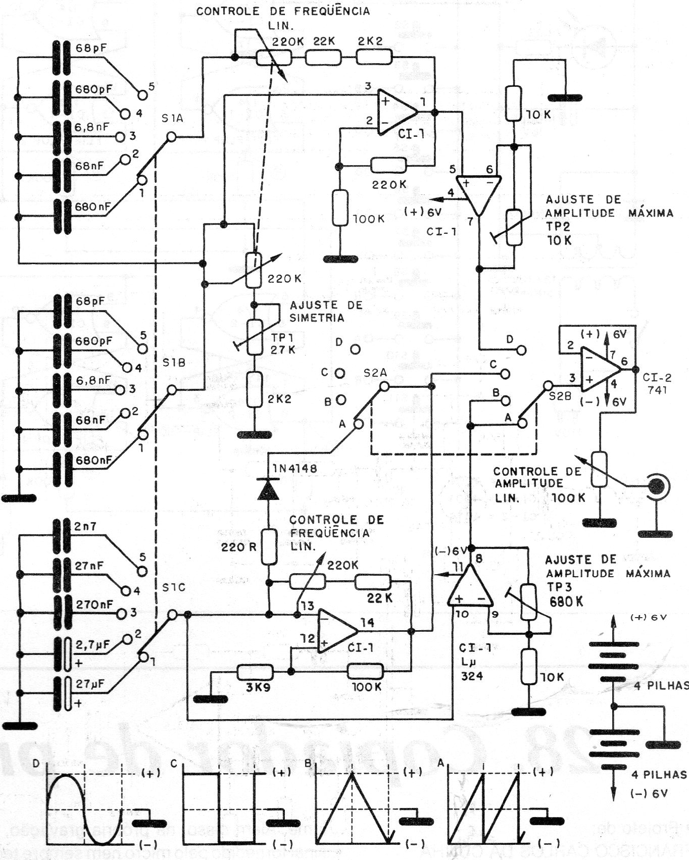 Este circuito es de una documentación de 1986, pero puede ser montado con facilidad usando la mayoría de los amplificadores operacionales disponibles actualmente. La fuente de alimentación tanto puede ser formada por pilas como ser del tipo con transformador con tensión de 6 a 9 V simétricos, según el operacional usado. El circuito genera señales de 1 a 100 kHz en 5 pistas seleccionadas por una llave. Las formas de onda se muestran en la figura.