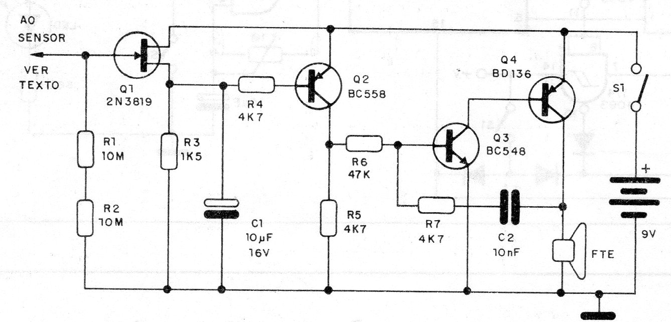 Este sensible circuito de toque que dispara un oscilador utiliza sólo transistores. El circuito es alimentado por pilas, pudiendo servir como una alarma o aún en demostraciones. El JFET puede ser el BF245 y el sensor un pedazo de hilo o una placa de metal.