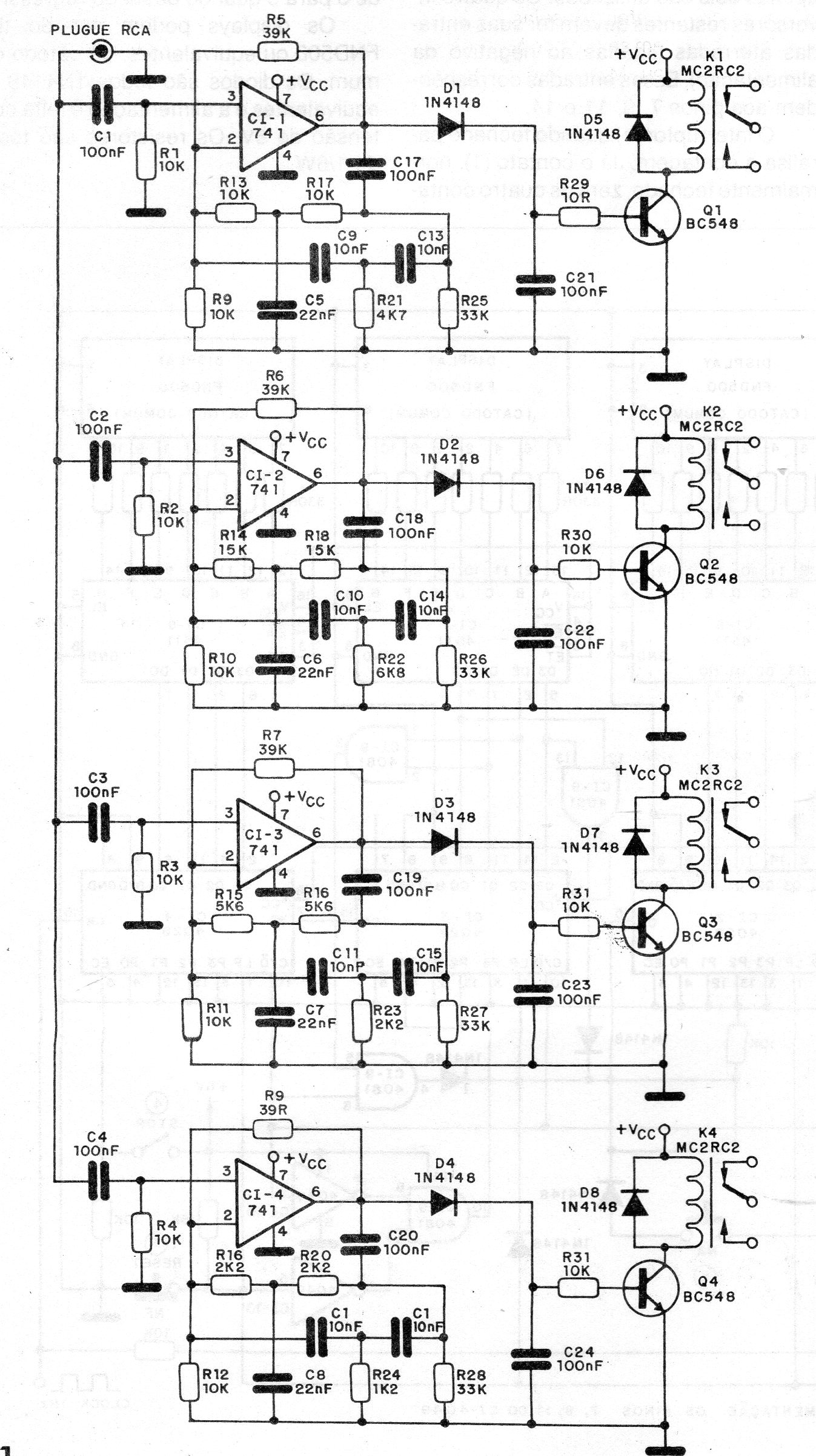 Este circuito fue elaborado originalmente en 1989 para permitir el accionamiento de cargas a partir de señales de audio generadas por una microcomputadora MSX. Sin embargo, puede ser utilizado con el mismo propósito para servir como escudo de control para microcontroladores del tipo Arduino u otros. Con él la señal de audio generada por el microcontrolador puede accionar uno de 4 relés, según su frecuencia, determinada por los dobles T. El circuito puede ser alimentado por tensiones de 6 a 12 V conforme el relé y la señal de accionamiento puede ser de 3, 3 a 5 V.