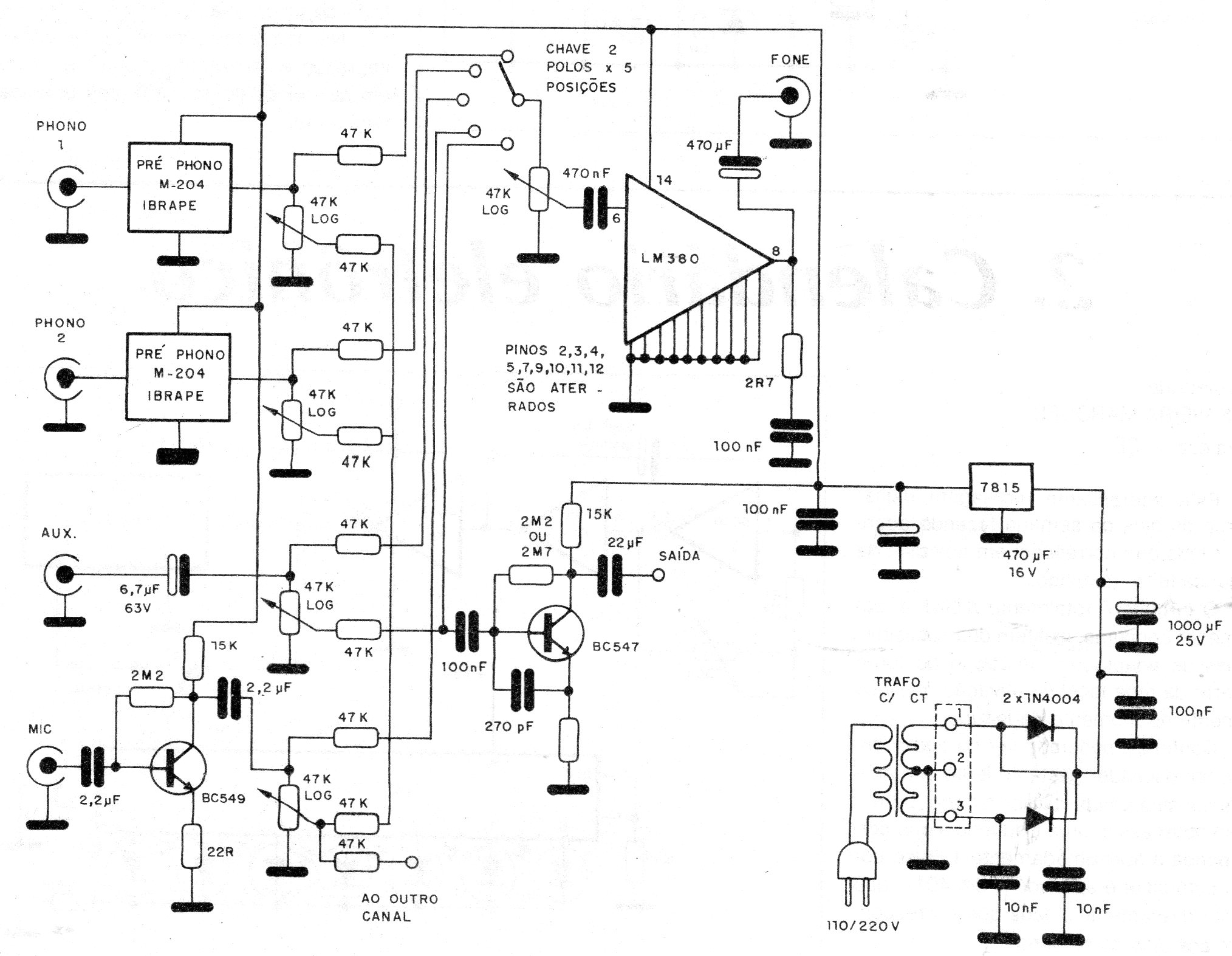 Este mezclador o mezclador de 4 canales fue encontrado en una documentación de 1986. Utiliza dos etapas Ibrape vendidas en un kit en la época y cuyo esquema se puede encontrar en el artículo de este sitio. Estos pasos eran ecualizadores y preamplificadores de excelente calidad. El amplificador de audio utilizado como monitor no es muy común actualmente, pudiéndose utilizar un equivalente más moderno como el LM386 o TODA7052.