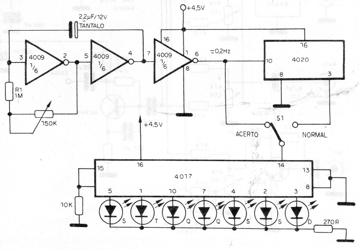 Encontramos este circuito CMOS en una documentación de 1989. La precisión dependerá del ajuste que se realiza en el trimpot. Este ajuste se realiza ajustando el trimpot para que los LED cambien una vez cada 5 segundos aproximadamente. El circuito es alimentado por 3 o 4 pilas pequeñas o fuente de 5 o 6 V.