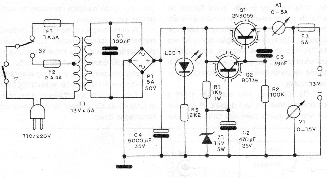 Esta fuente convencional con transistores fue encontrada en una documentación de 1989. Los transistores deben montarse en disipadores de calor y el puente de diodos puede ser reemplazado por 4 diodos de 5 A x 50 V. El circuito está indicado para la alimentación de radios y tocacintas antiguas de radios y también reproductores de CD hasta 5 A de corriente.