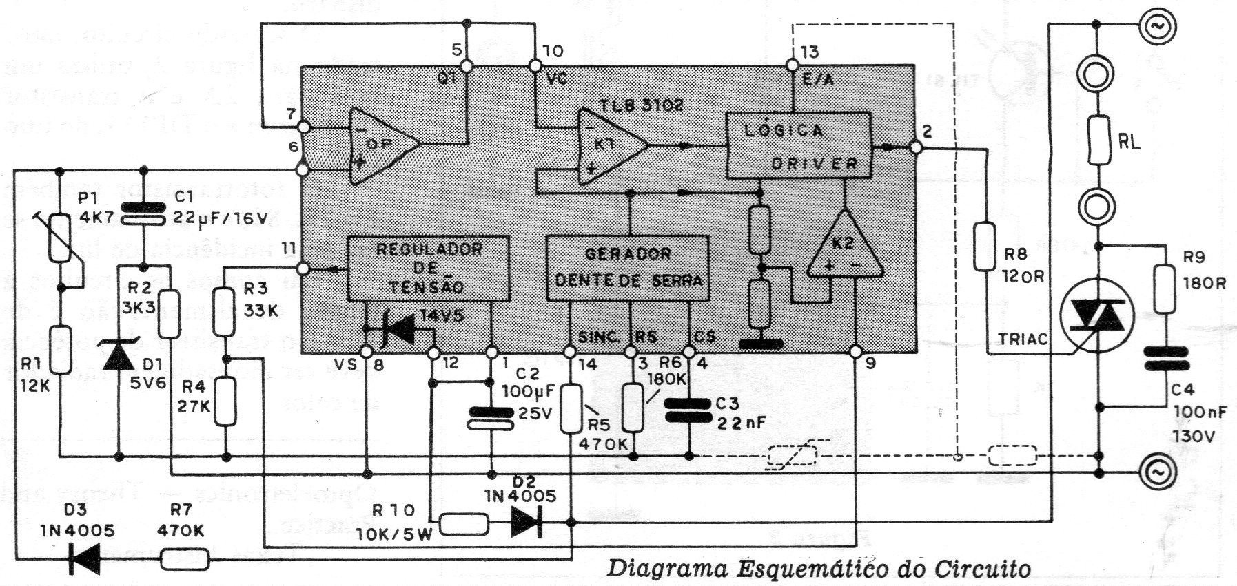El circuito integrado, en esta aplicación de 1986, no es un componente muy común actualmente. El circuito conmuta la tensión de carga de 110 V a 220 V o viceversa, El triac debe estar dotado de disipador de calor y tener corriente de acuerdo con la carga controlada que, preferiblemente, debe ser resistiva.