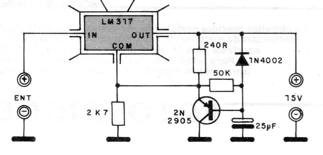 Este circuito hace que la tensión en la salida del regulador suba lentamente hasta el valor determinado por los resistores en el divisor, en el caso 15 V. El resistor de 2k7 puede ser alterado para obtener otra tensión máxima. La tasa de subida de la tensión es determinada por el condensador. La corriente máxima es de 1,5 V, pero se puede utilizar el LM350 a 3 A.