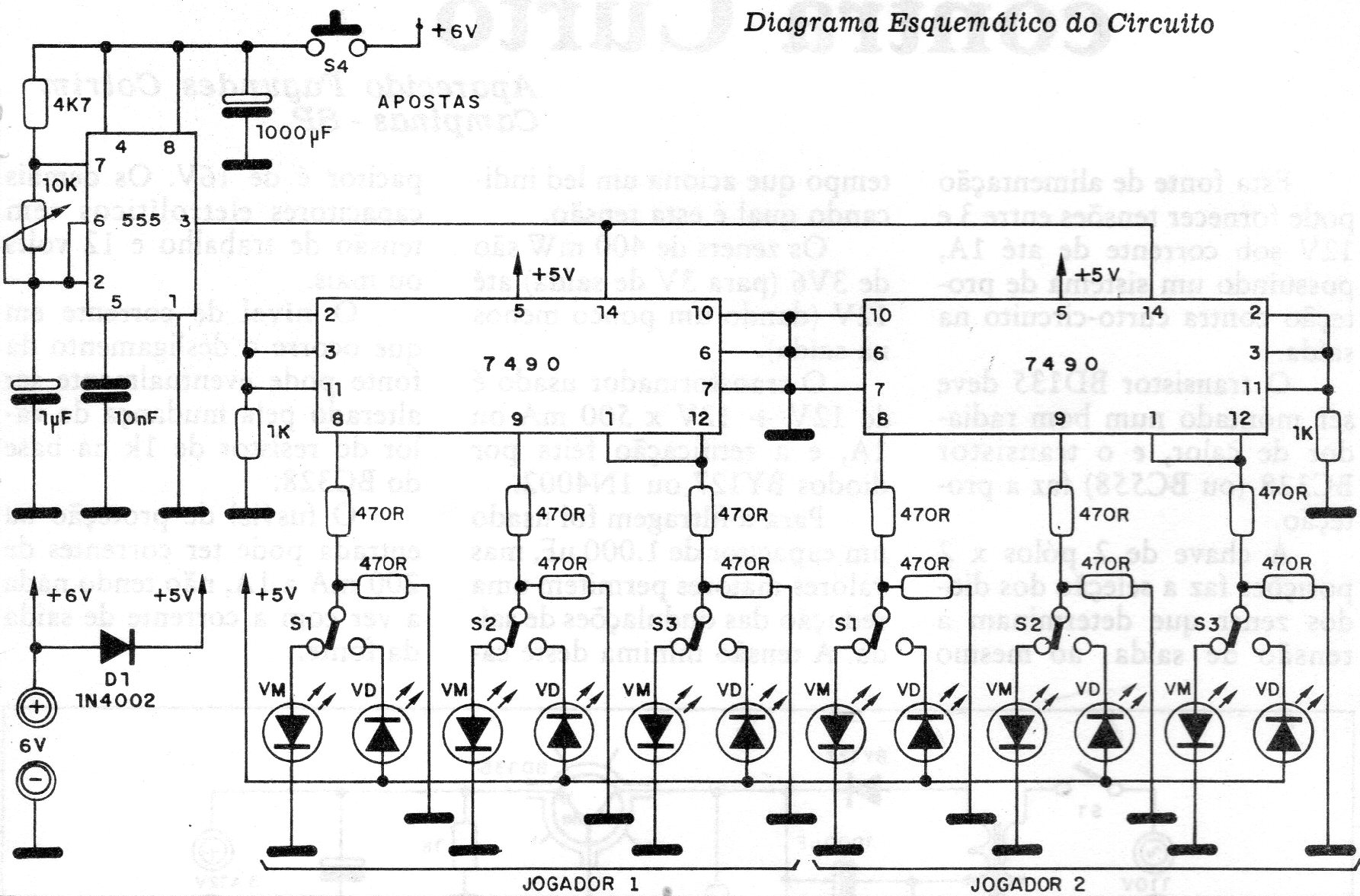 El juego es una adaptación de la versión real donde los palillos quitados son reemplazados por LEDs rojos y los colocados por LEDs verdes. Cuando el jugador activa una llave suya, y enciende el LED verde, esto indica que ha ganado, y cuando un jugador tiene 3 LEDs encendidos, esto indica que no tiene más palillos y con ello ganó el juego. El circuito es alimentado por pilas, pero tiene un reductor para 5 V (diodo) ya que se utiliza tecnología TTL. Una sugerencia es implementar el juego con microcontrolador en una versión moderna.