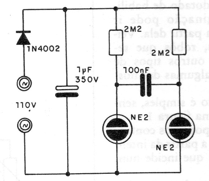 Esta es una configuración tradicional de parpadeante con dos lámparas de neón. La frecuencia es dada por el capacitor de 100 nF que debe ser alterado. Este capacitor debe tener una tensión mínima de trabajo de 100 V. El circuito también funciona en 220 V con una tensión mayor para el capacitor de 1 uF.
