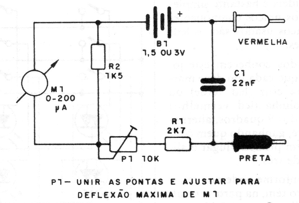 Este es un probador de continuidad bastante simple, alimentado por una o dos pilas de cualquier tamaño. El ajuste del fondo de escala para el instrumento usado se realiza en P1. El instrumento original es un microamperímetro de 0 a 200 uA común.