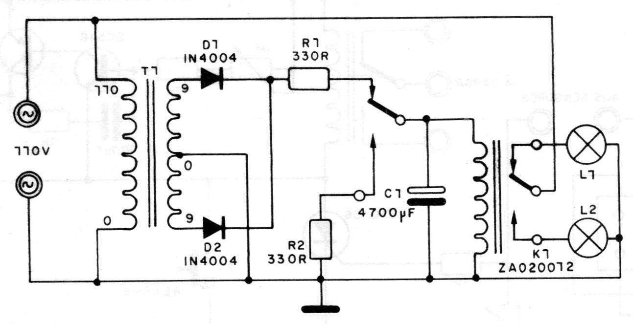 Esta es una solución simple para vehículos antiguos que no posean este recurso, que se encuentra en una documentación de 1986. El circuito es para la red de 110 V, pero puede ser alimentado por 12 V con la eliminación del transformador y de los diodos rectificadores. El circuito hace que dos lámparas parpadeen alternativamente. Se pueden controlar los LED.