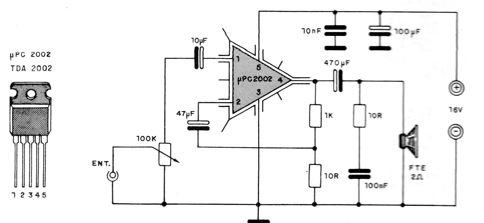 El circuito uPC2002 es equivalente al TDA2002 en este circuito de 1986. Este circuito integrado debe estar dotado de disipador de calor y la alimentación de 12 a 16 V debe tener una corriente de al menos 4 A. El circuito funciona con cargas de 2 a 8 ohms , pero con 8 ohmios la potencia es menor.