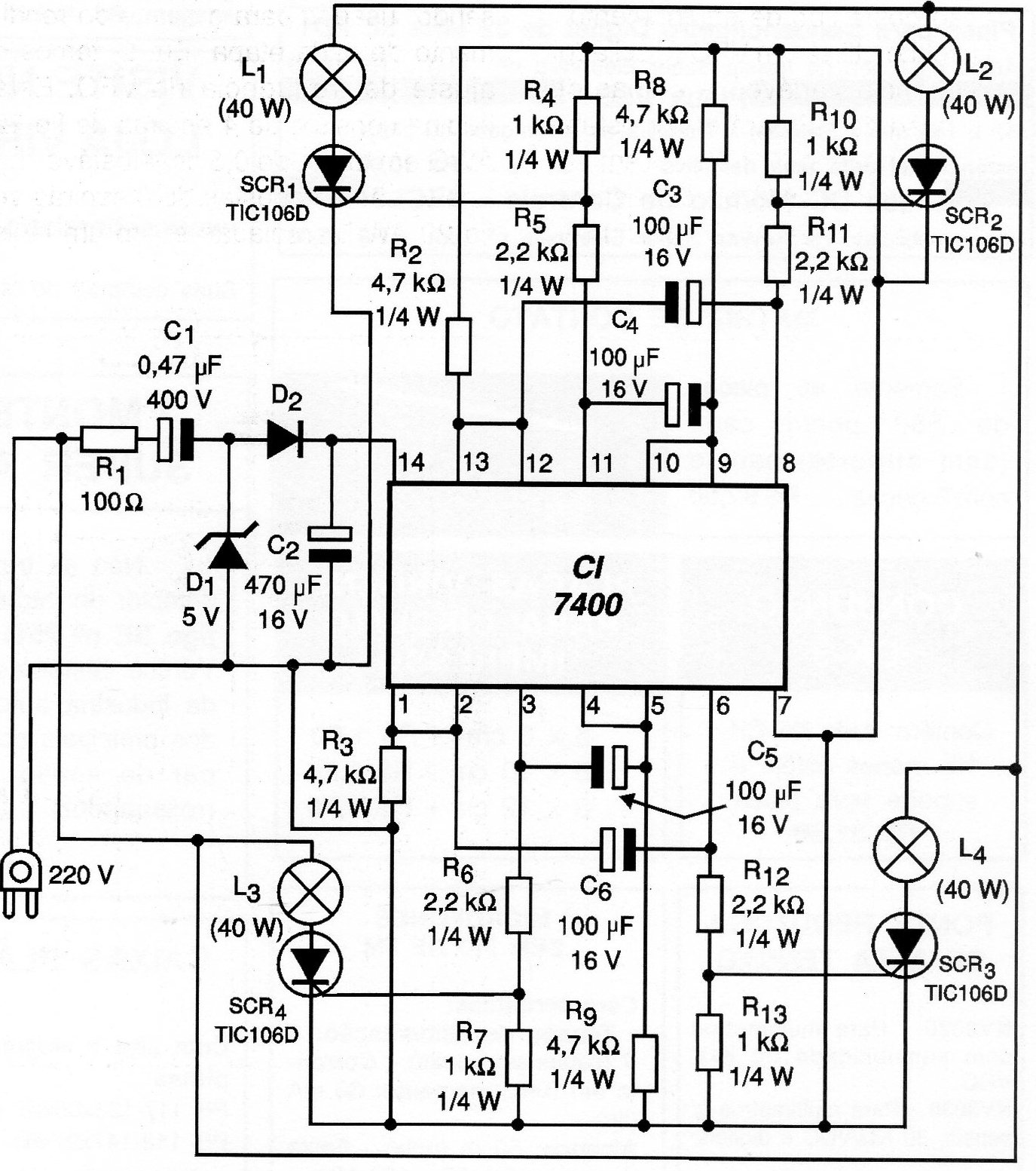 Este circuito excita lámparas incandescentes haciéndolas parpadear alternadamente. Son 4 salidas y no se deben utilizar lámparas de otro tipo. El circuito tiene una fuente sin transformador alimentado por la red de energía. Los SCR deben estar dotados de disipadores de calor.
