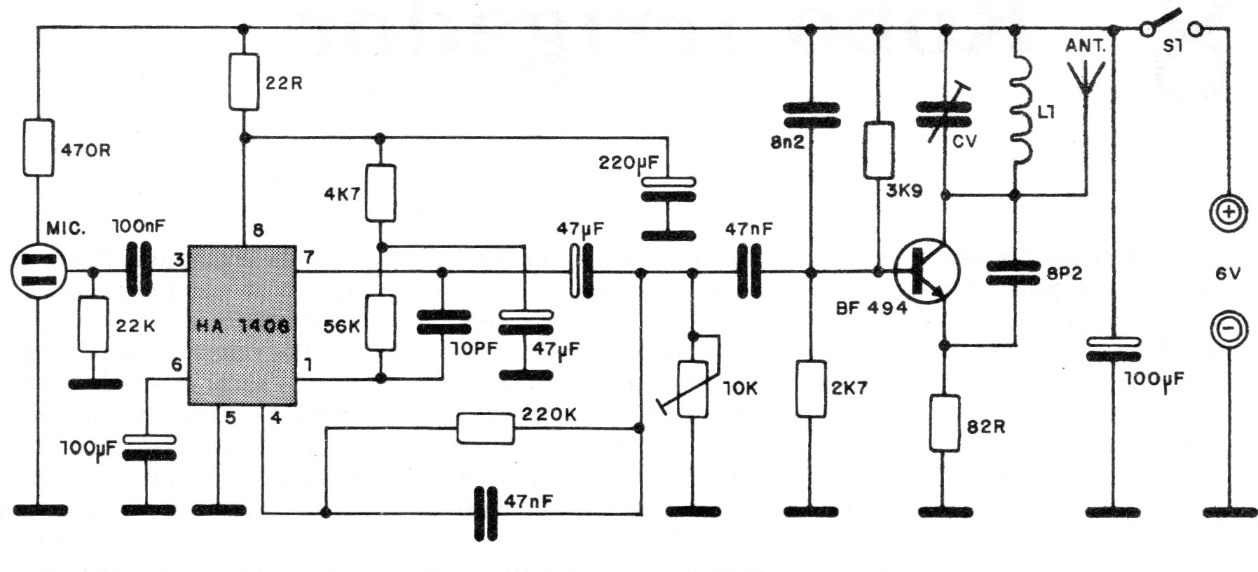 El circuito integrado utilizado en este micrófono inalámbrico de 1986 no es muy común actualmente. La bobina L1 consta de 4 4piras de hilo 26 o 28 en forma de 1 cm de diámetro sin núcleo. En el original se utilizó el micrófono de electreto de tres terminales, pero se pueden hacer adaptaciones para usar micrófono de dos terminales.