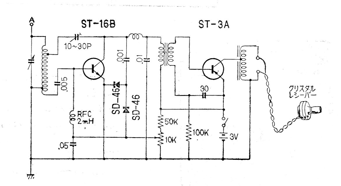El receptor comercial MT2B fabricado en Japón en los años 60 tenía escucha sólo en auricular y era alimentado por dos pilas pequeñas o 3 V. El circuito utiliza algunos componentes difíciles y la bobina tiene 10 + 80 + 10 espiras de cable 32 en bastón de ferrita o, cerca de eso.