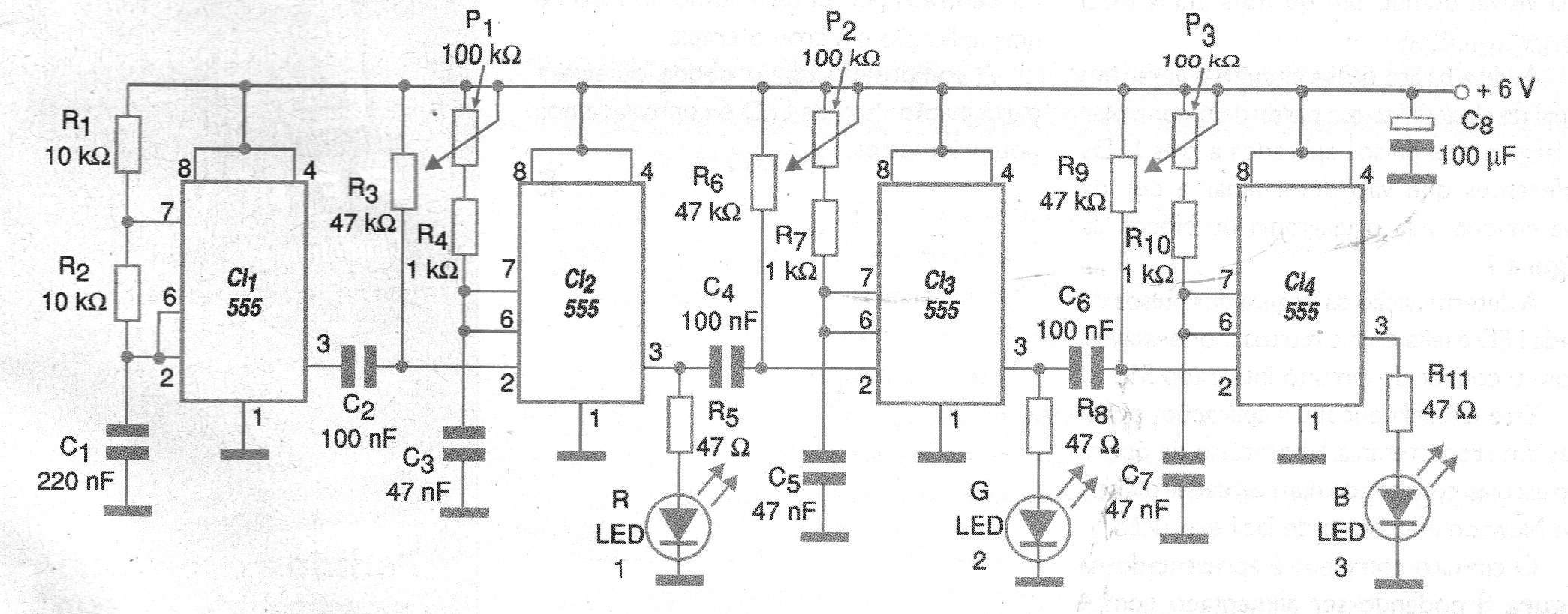 Con este circuito se pueden controlar de modo secuencial tres LED de colores diferentes. Los ajustes de los tiempos de funcionamiento de cada LED son realizados por los trimpots. Los resistores en serie con los LED dependen de la corriente deseada y pueden quedar entre 47 ohms y 1k.