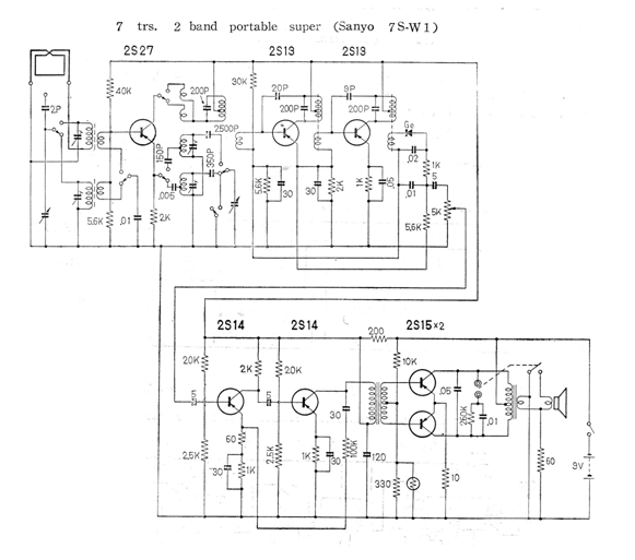 Este receptor comercial fabricado por Sanyo en los años 60 usaba antena de cuadro. El circuito es japonés con 7 transistores y tiene todavía el rango de ondas cortas de 3,9 a 12 MHz. El circuito se alimenta con 9 V procedentes de pilas o una batería potente. La salida de audio llega a 350 mW.