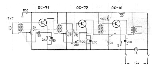 Este es un circuito comercial japonés de los años 60. El circuito es alimentado por una fuente simple de 12 V y los componentes críticos son los transformadores, además de los transistores. El circuito se destina al uso portátil con micrófonos de baja impedancia.