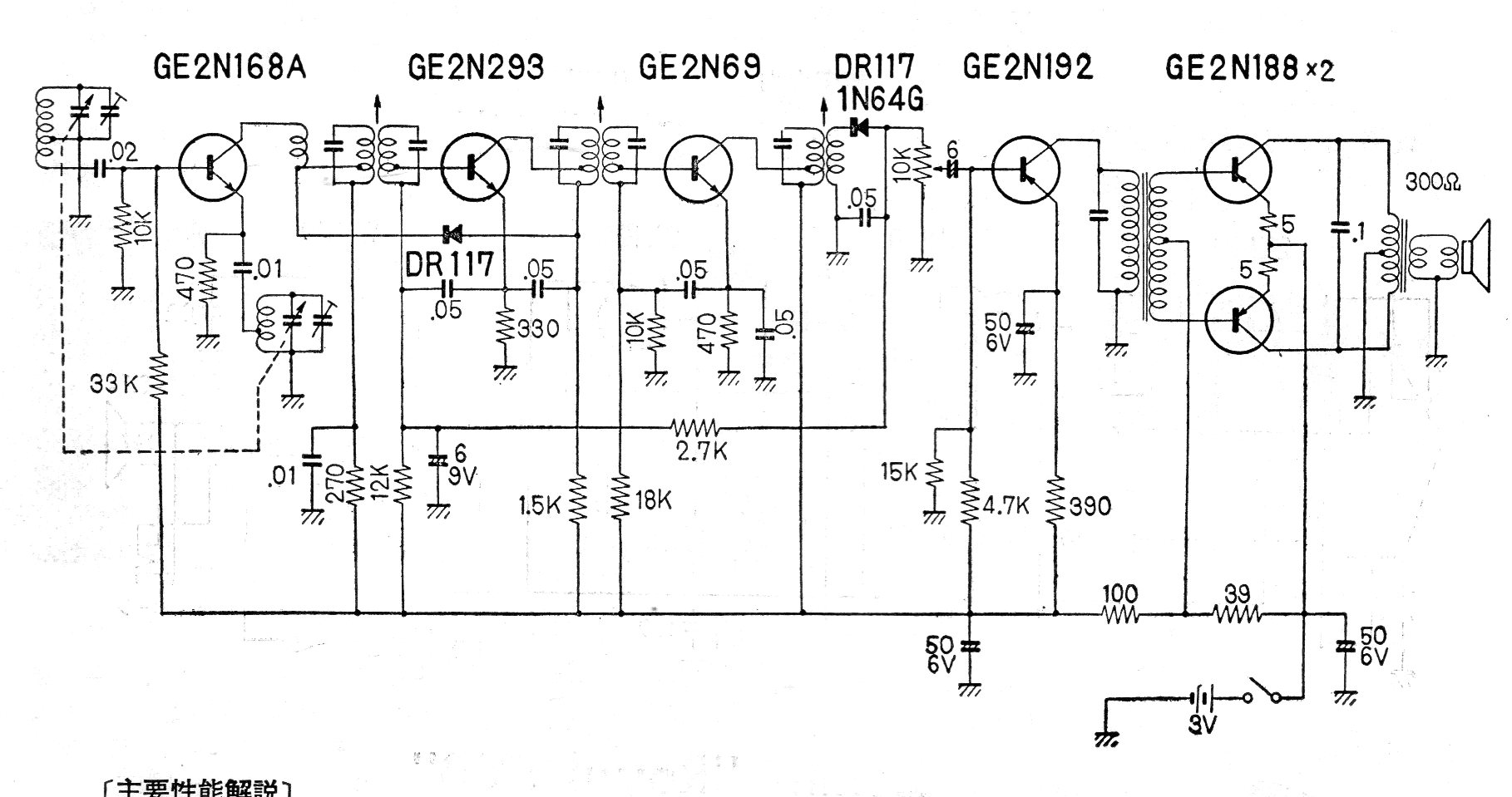 Esta radio transistorizada era fabricada en los años 60 y tiene 6 transistores de la época, El circuito era alimentado por dos pilas y tenía un consumo típico de 7 mA. El circuito es un super-heterodino para la banda de ondas medias.