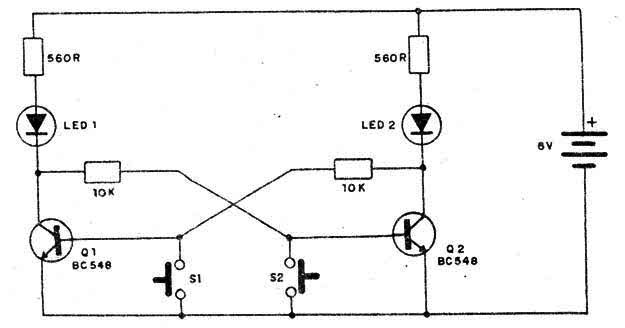 Este circuito puede servir para demostraciones y clases sobre electrónica digital, dando el principio de funcionamiento de la unidad de memoria o cuenta digital que es el flip-flop. Los interruptores de presión sirven para armar y rearmar el flip-flop del tipo R-S. La alimentación, si se altera a 12V, debe ser acompañada del cambio de los resistores de 560 ohm por resistores de 1k.