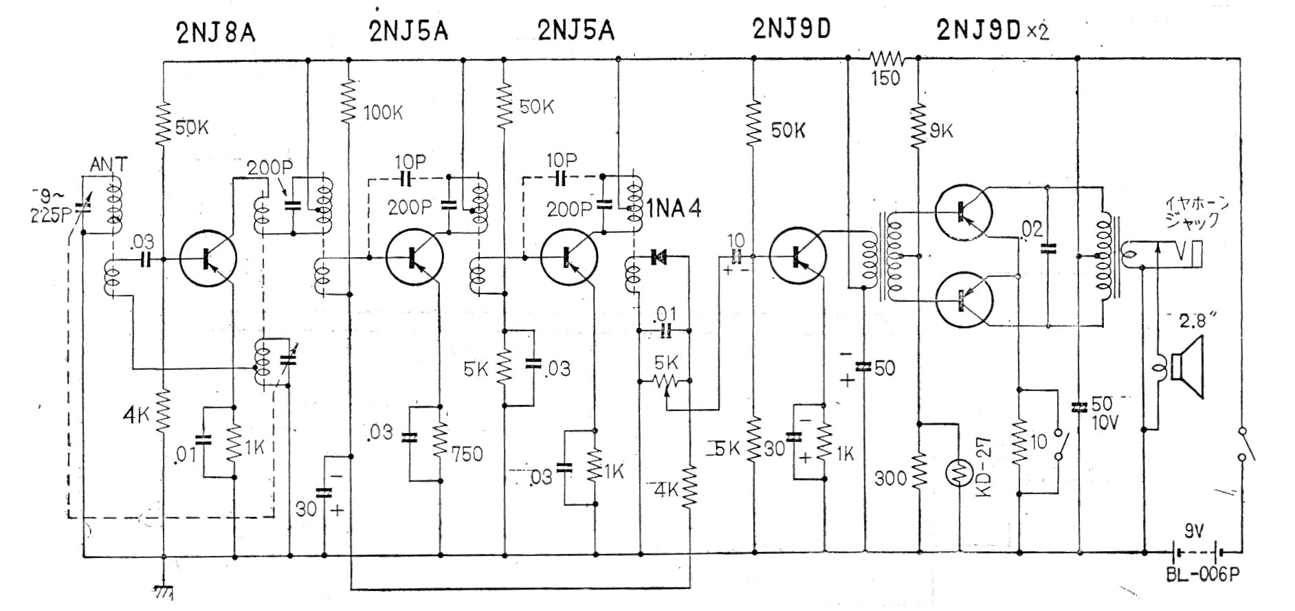 Este radio transistorizado japonés fue fabricado en los años 60 en Japón. El circuito de 6 transistores es para el rango de ondas medias siendo alimentado por una batería de 9 V. Los transistores son de germanio de la época.
