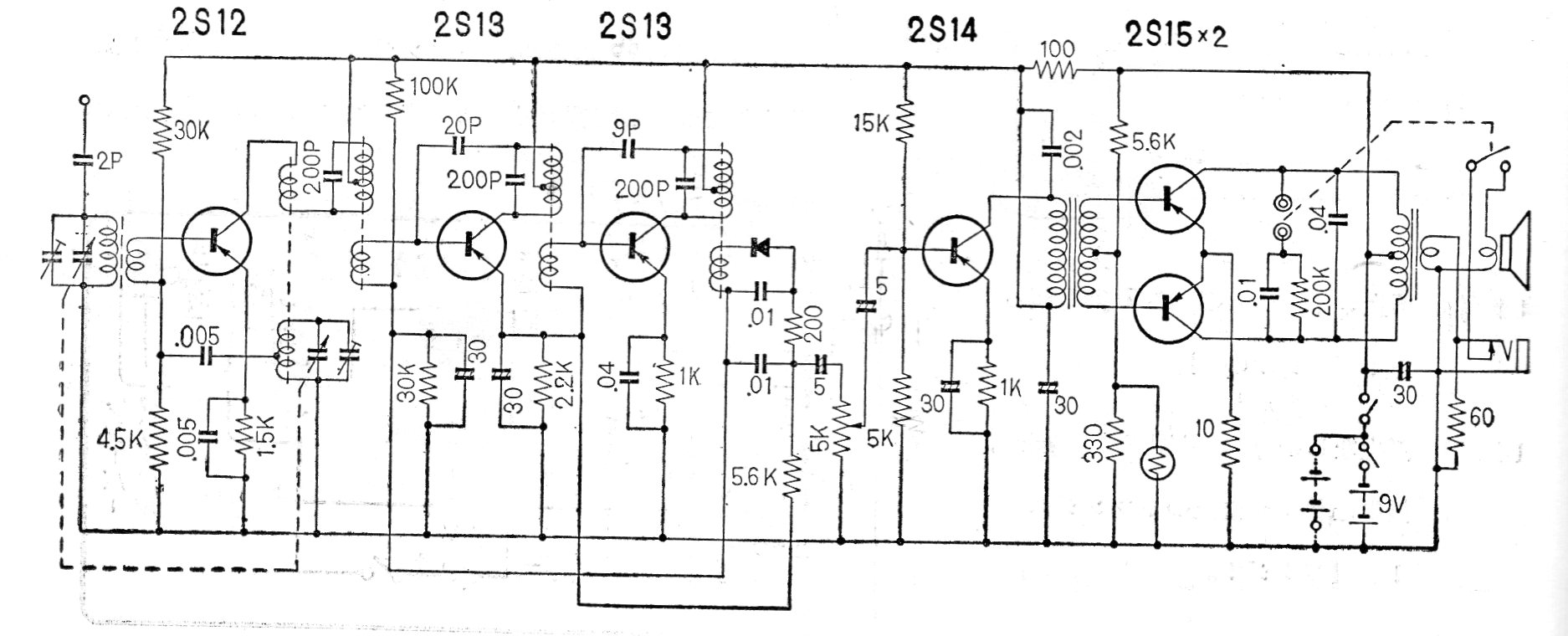 Esta radio comercial japonesa de 6 transistores fue fabricada en la década de 60. El receptor es del tipo super-heterodino con transistores de germanio y es alimentado por una tensión de 9 V.