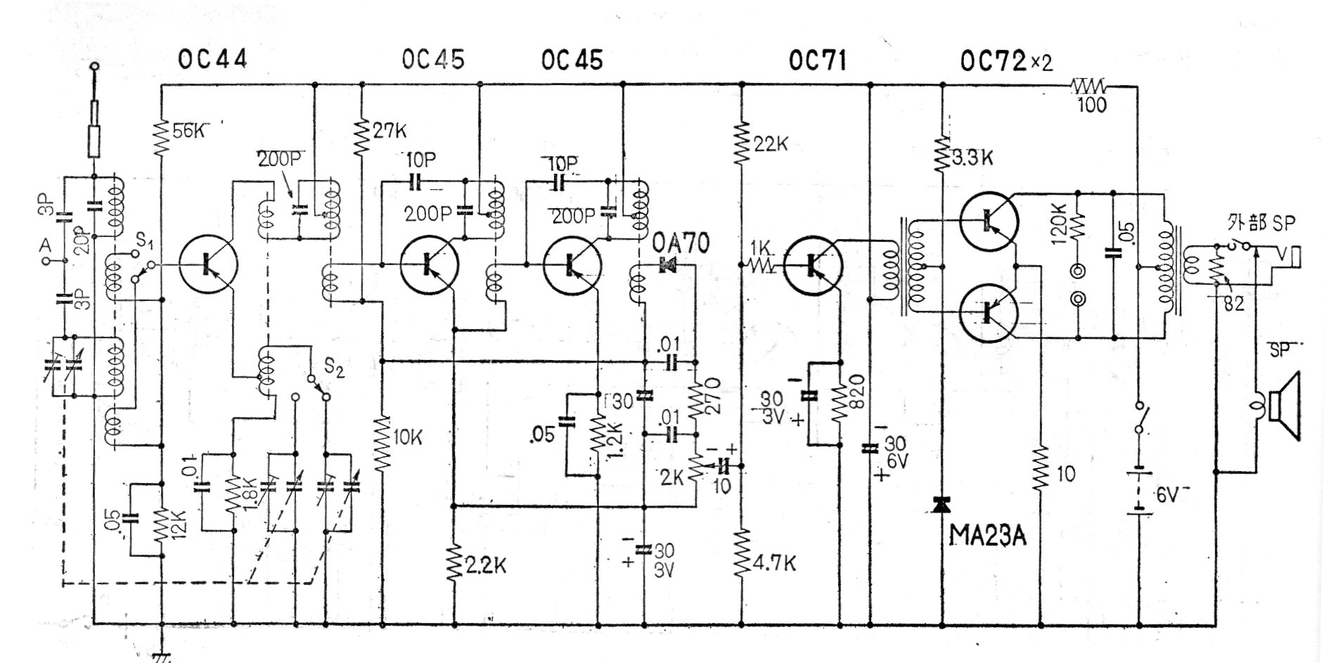 Este receptor de 6 transistores fue fabricado en Japón en la década de 60. El circuito es super-heterodino y tiene alimentación de 6 V. El receptor recibe las bandas de ondas medias y cortas de 3,925 a 9 MHz.