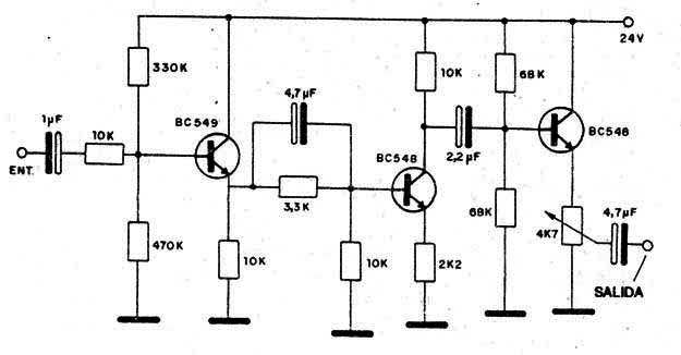 Este excelente preamplificador tiene una impedancia de entrada del orden de 200 k. Su ganancia de tensión es aproximadamente unitaria en la etapa de entrada y de 5 veces en la etapa final. Los capacitores electrolíticos deben tener una tensión de trabajo de por lo menos 25 V. El consumo de corriente entre 2 y 4 mA permite la utilización de la fuente del propio amplificador con el cual el mismo operará.