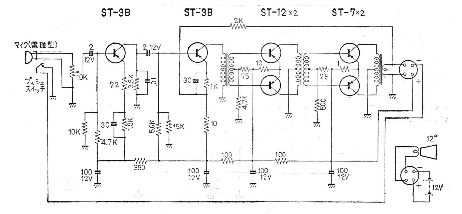 Este circuito es de un megáfono de la NEC fabricado en Japón en los años 60. El circuito tiene 4 W de potencia y utiliza un altavoz de compresión. El circuito tiene dos etapas en push-pull clase B y utiliza micrófono cerámico o de cristal de alta impedancia. La alimentación se realiza por batería de 12 V.
