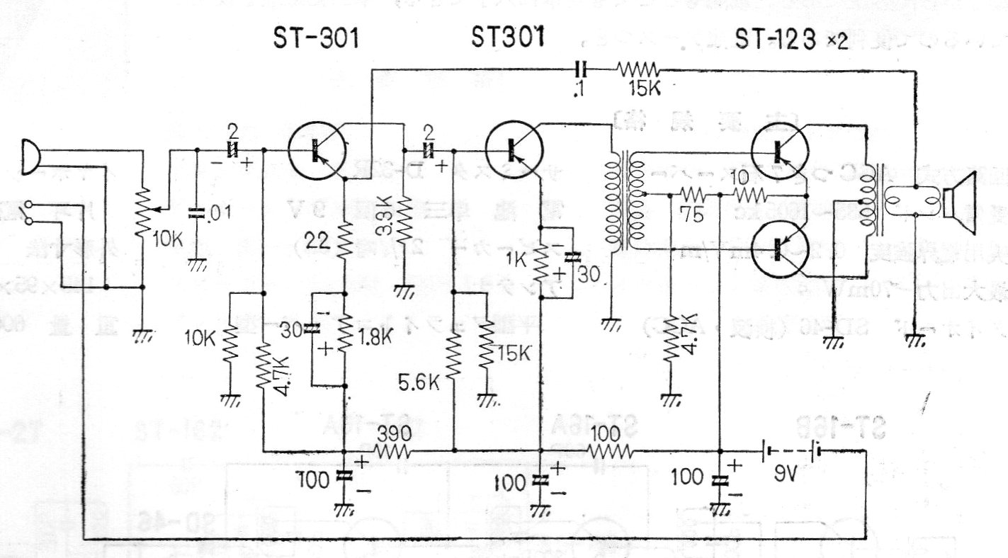 Este amplificador comercial de NEC fue fabricado en Japón en los años 60. El circuito utiliza 4 transistores de la época y era alimentado por una tensión de 9 V de batería formada por pilas grandes.