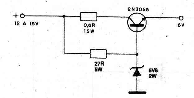 Este reductor hace uso de un zener de potencia y de un transistor 2N3055, que debe ser montado en un buen disipador de calor. Los resistores deben ser de alambre y la corriente máxima de salida es de 5A. Un fusible de protección es recomendable, en serie con la entrada, si la fuente usada no lo posee.