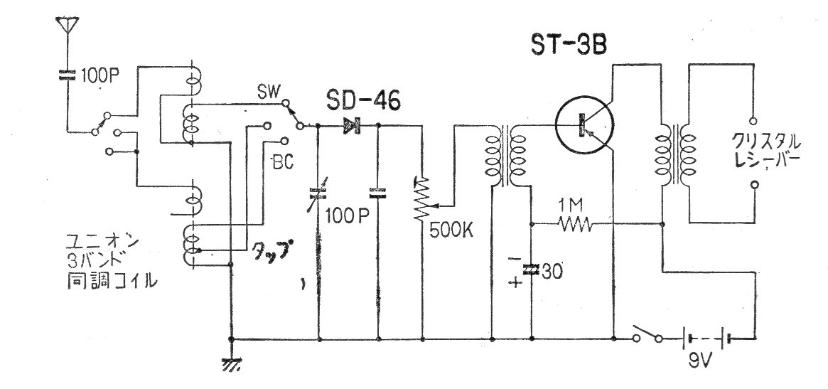 Este receptor de dos bandas capaz de sintonizar ondas medias y el rango de 3,5 a 10 MHz se vendía en Japón en los años 60 con el nombre TR1k. El circuito usaba transistores de germanio y los detalles de las bobinas no se suministra en el diagrama.
