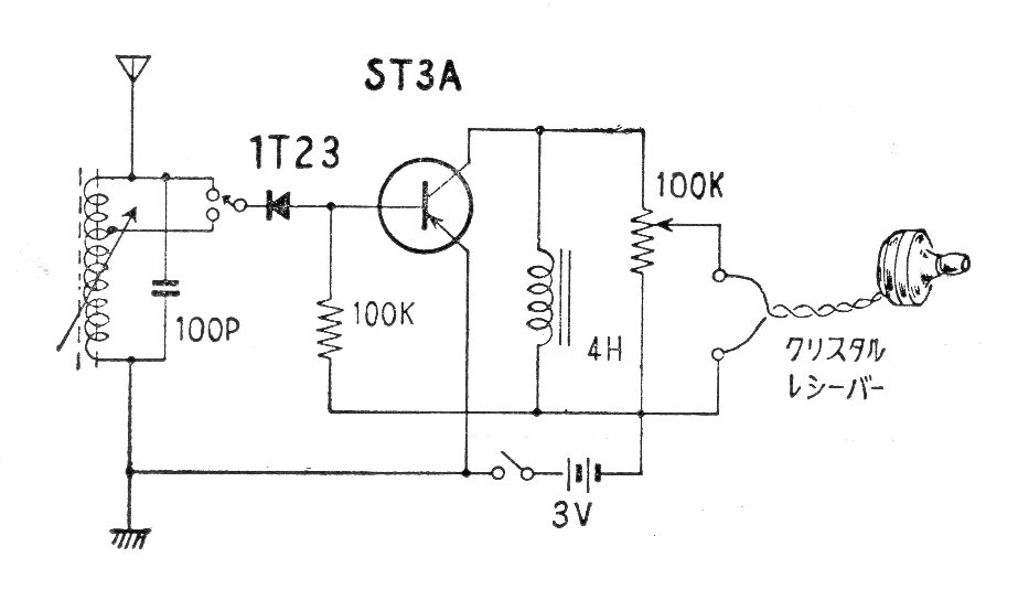 Este simple receptor para escuchar en auricular se vendía en los años 60 en Japón. El circuito utiliza un solo transistor de germanio y es alimentado por una tensión de 3 V obtenida de dos pilas. La bobina tiene 40 + 60 espiras de hilo 32 a 28 en bastón de ferrita.