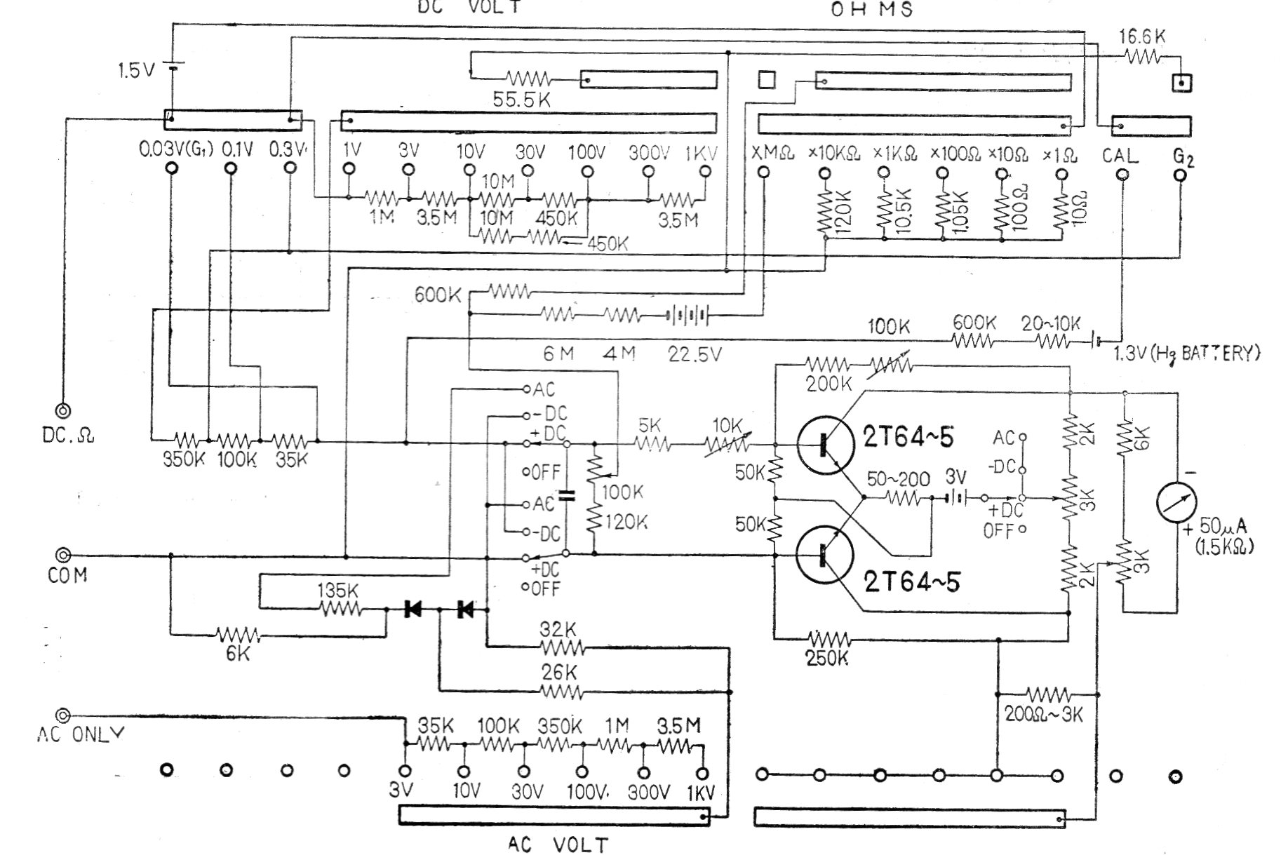 Este es el circuito de un multímetro - voltímetro analógico comercial, vendido en Japón en los años 60. El circuito cuenta con diversas escalas y transistores para obtener una entrada de impedancia elevada en el accionamiento del instrumento indicador.