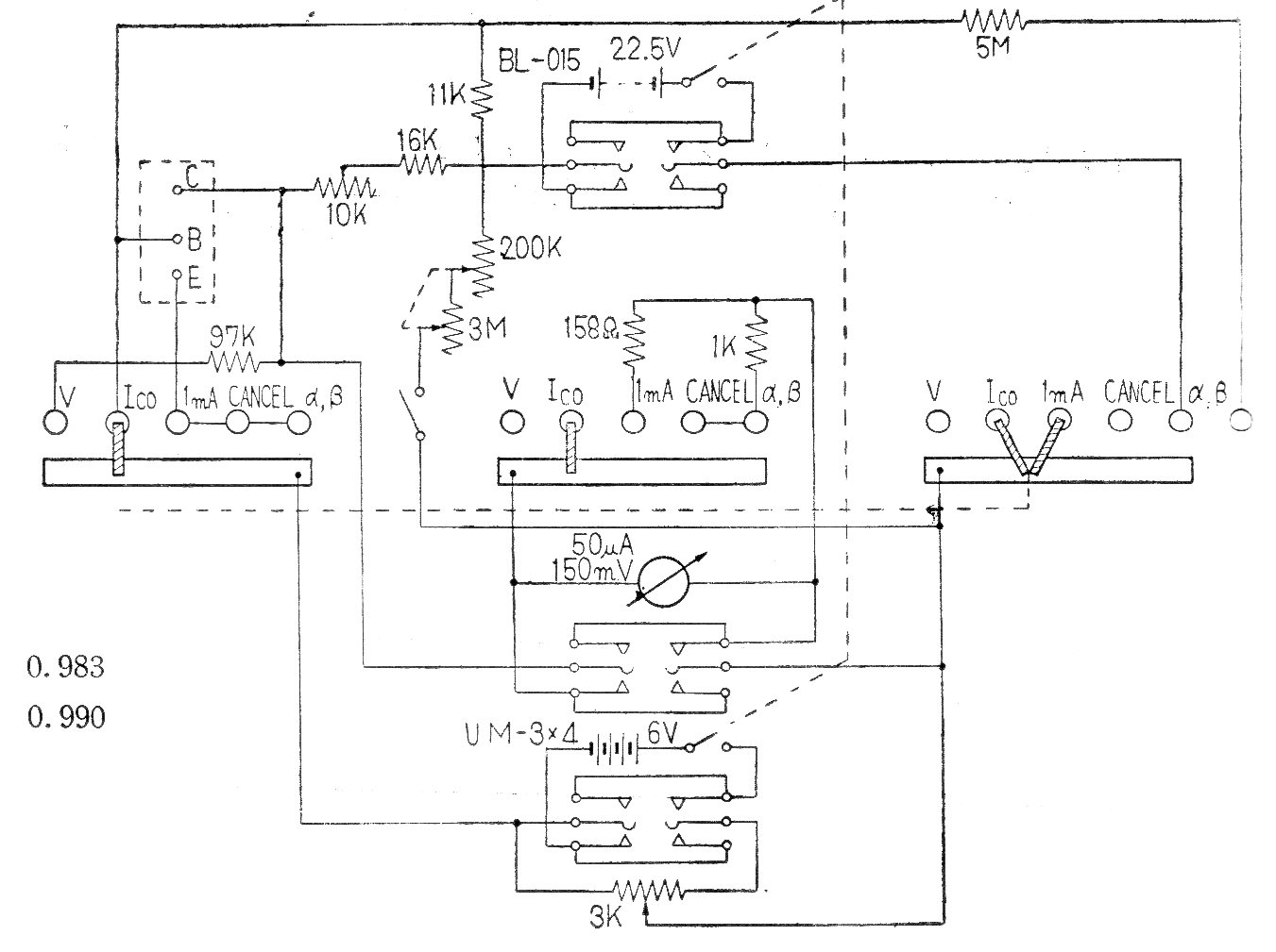 Presentamos el circuito del probador comercial de transistores Sanwa SC2 vendido en Japón en los años 60. El circuito tiene varias escalas y tipos de prueba siendo alimentado por batería de 22,5 V.