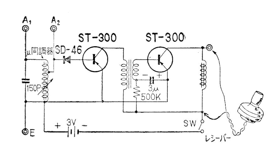 Esta pequeña radio AM de dos transistores se vendía en los años 60 en Japón. El circuito era alimentado por dos pilas y tenía escucha exclusiva en auriculares. La bobina tiene 20 + 80 espiras de hilo 28 a 32 en un bastón de ferrita.
