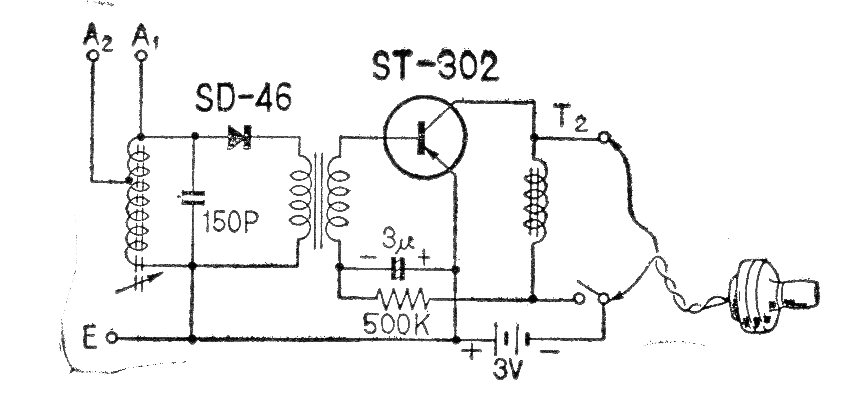 Este simple receptor de ondas medias se vendía en los años 60 en Japón. El circuito usaba transistores de germanio y la escucha hecha en auriculares de cristal. La alimentación era hecha por dos pilas. La bobina consiste en 20 + 80 espiras de hilo 28 a 32 en un bastón de ferrita.