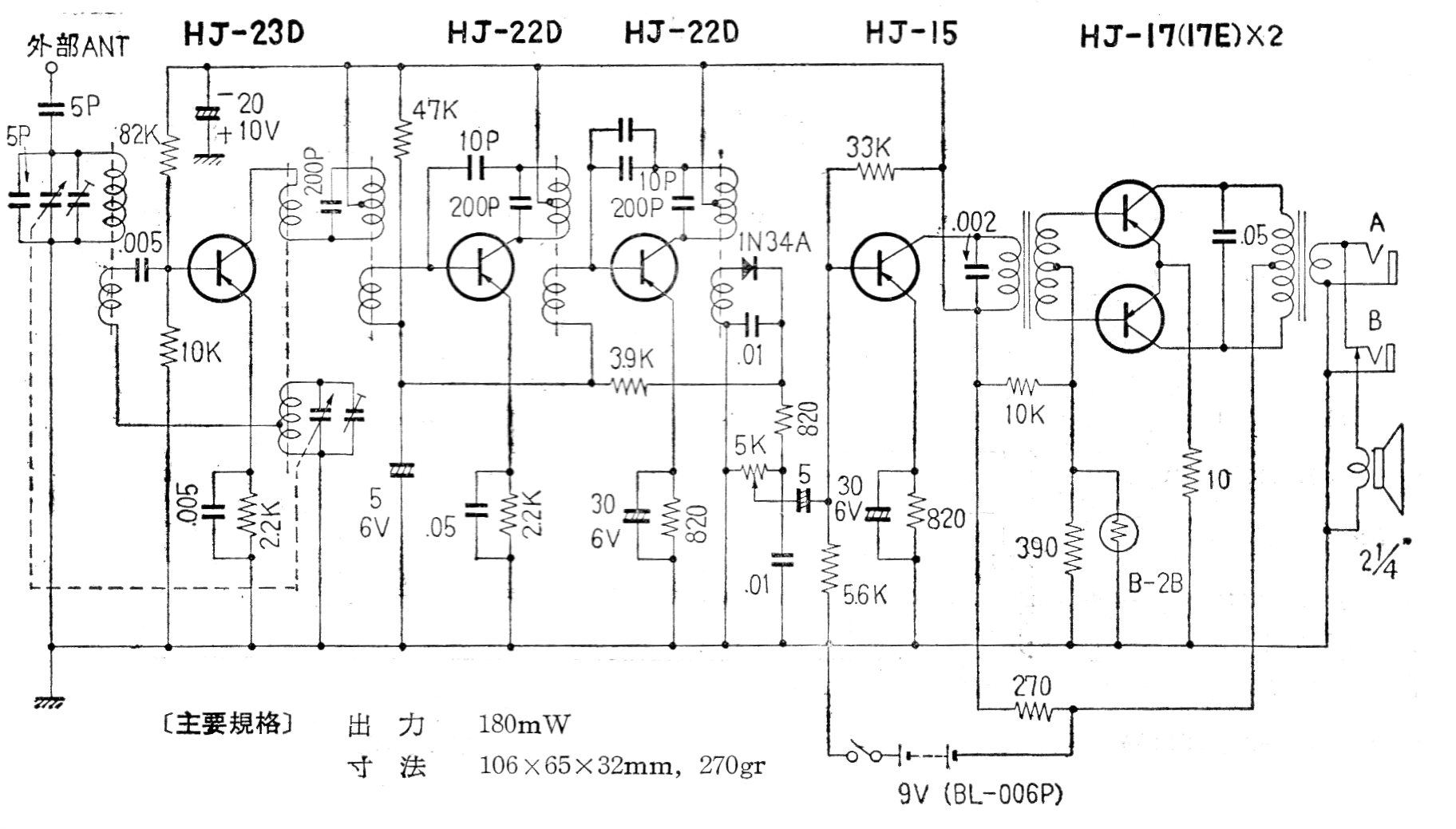 Esta radio japonesa de 6 transistores de los años 60 usaba transistores de germanio y tenía una potencia de salida de 180 mW. El circuito es del tipo super-heterodino con salida en push-pull clase B.