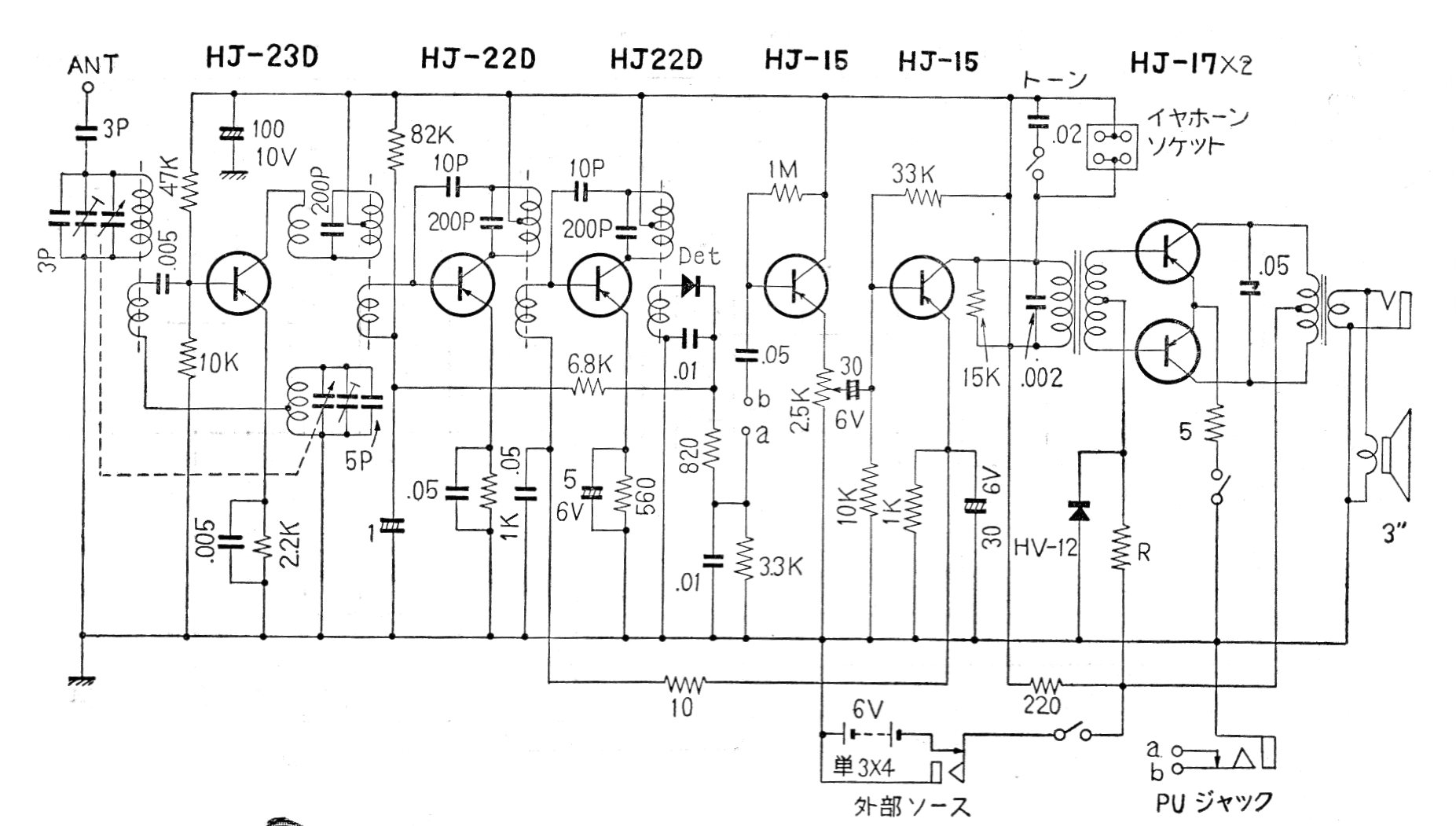 Este sensible receptor de 7 transistores de germanio fue fabricado en los años 60 en Japón. El circuito para la banda de ondas medias es del tipo super-heterodino y alimentado por una batería de 6 V (4 pilas). Encontramos este circuito en una documentación japonesa de la época.