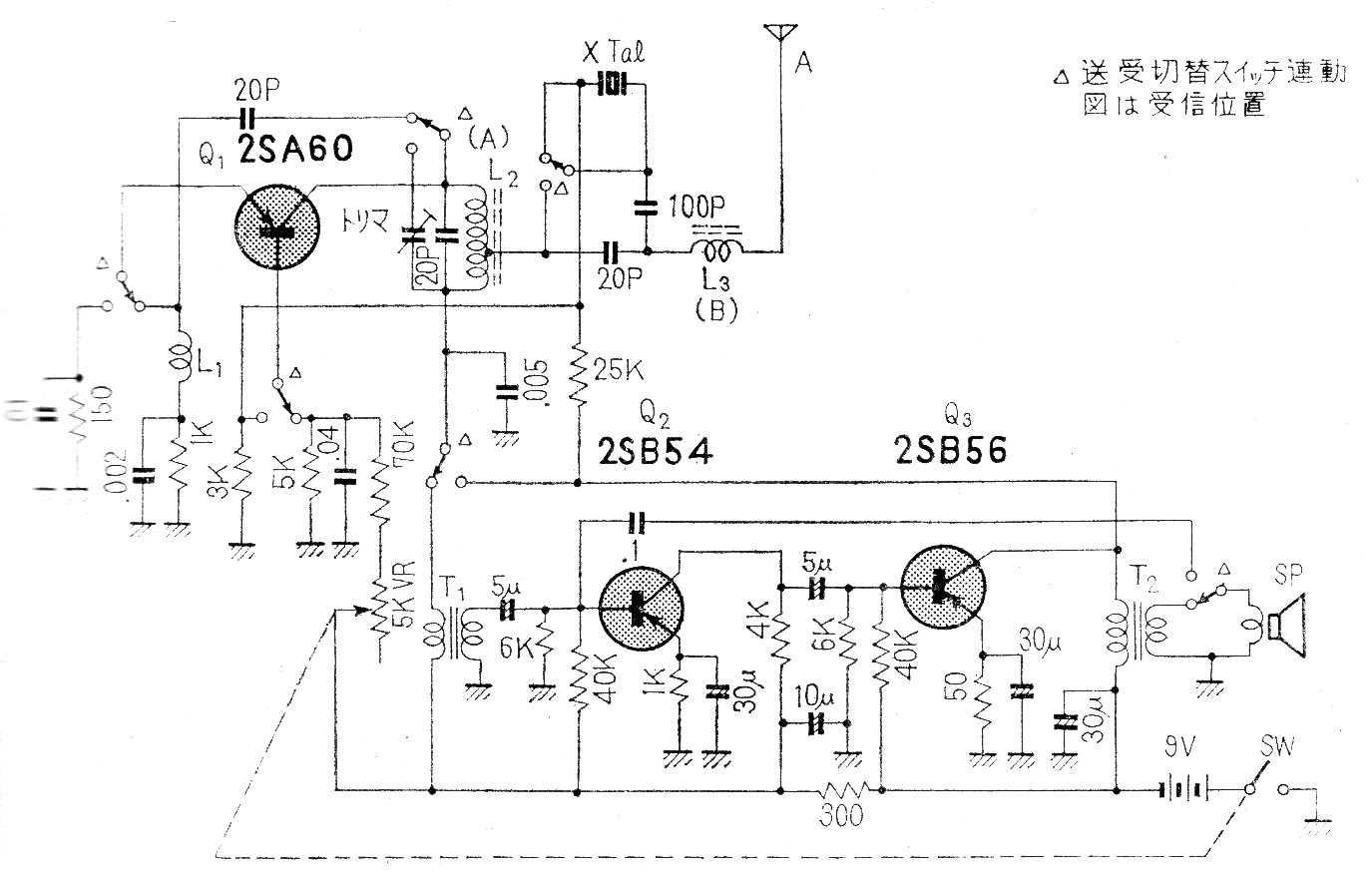 Este circuito fue encontrado en una antigua documentación japonesa. La bobina L2 consta de aproximadamente 12 vueltas de hilo 28 en un bastón de ferrita con toma en la cuarta espira y los transformadores son del tipo controlador y salida encontrados en antiguas radios transistorizadas. La antena es telescópica y la alimentación de la batería. El altavoz también sirve de micrófono.