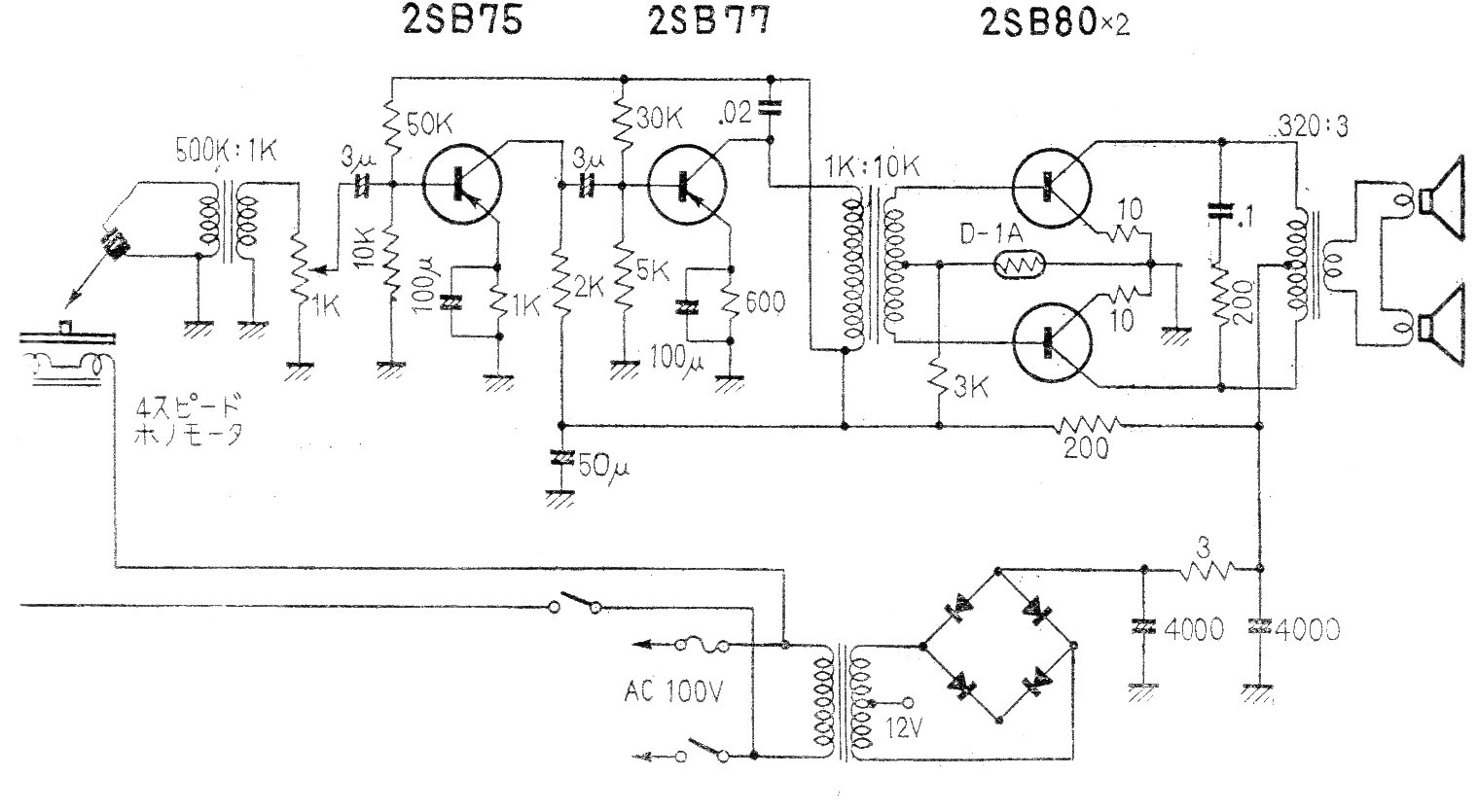 Este circuito es de una publicación antigua de Japón usando transistores de germanio de la época (años 60). El circuito proporciona algunos cientos de miliwatts a dos altavoces y los transistores de salida deben estar dotados de pequeños disipadores de calor.