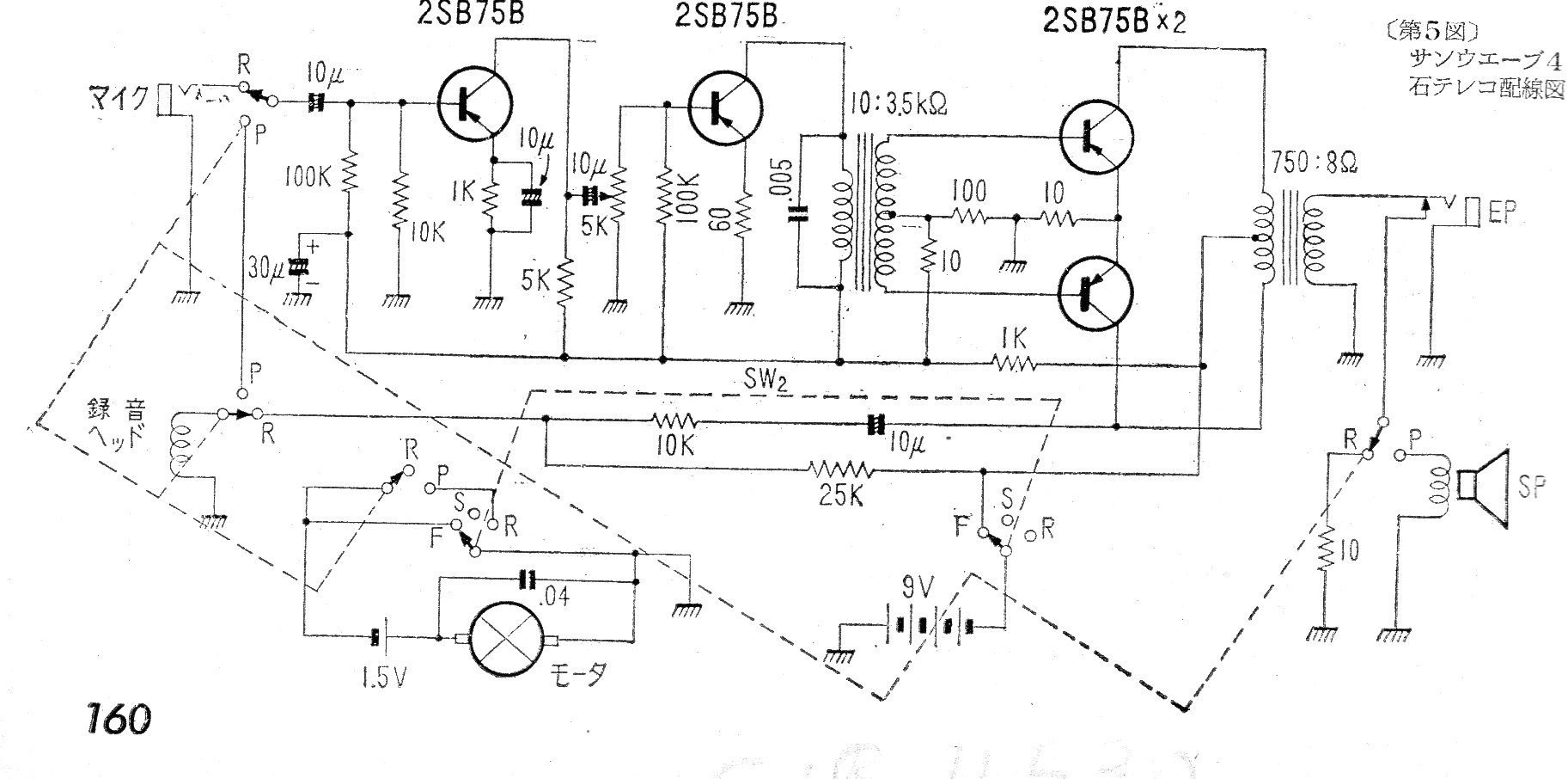 Este es el circuito típico de un amplificador para grabadora de cinta de los años 60. El circuito fue encontrado en una documentación japonesa haciendo uso de transistores de germanio. Los transformadores y los transistores son los elementos críticos de este circuito.