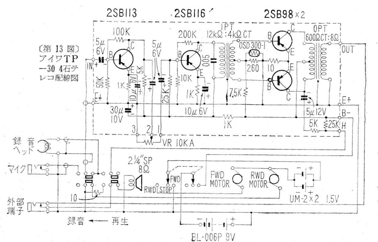 Este circuito formaba parte de un pequeño grabador de cinta de los años 60. El circuito era alimentado por dos pilas y una batería de 9 V. La potencia era inferior a 1 W. Los transformadores son tipos comunes en la época. Encontramos este circuito en una documentación japonesa de 1962.