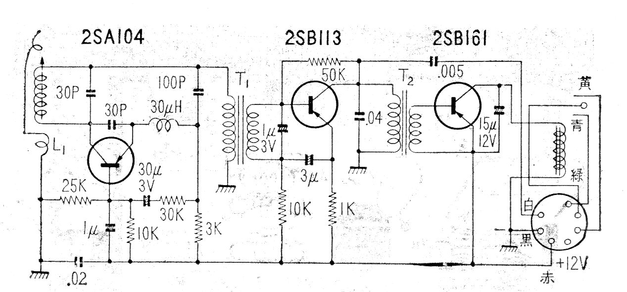 Este es el receptor para el transmisor CIR6221S que opera en el rango de 27 MHz. El circuito utiliza un servo de escape, es decir, a cada pulso del transmisor, el servo avanza una posición. El sistema es primitivo, pues la publicación es de 1964.