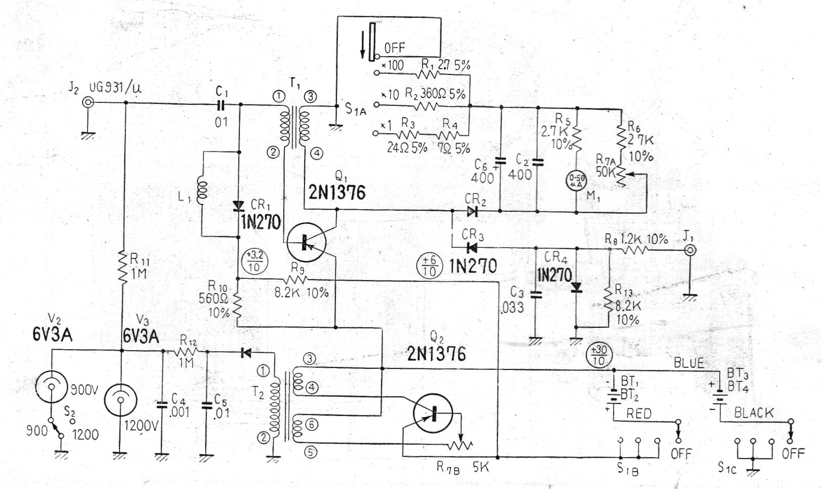 Encontramos este circuito en una publicación Radio TV & Electronics del Japón de los años 60. El circuito puede ser implementado con componentes modernos, pero la válvula Geiger es critica así como las reguladoras de tensión. El circuito es alimentado por batería y tiene un indicador del tipo analógico.