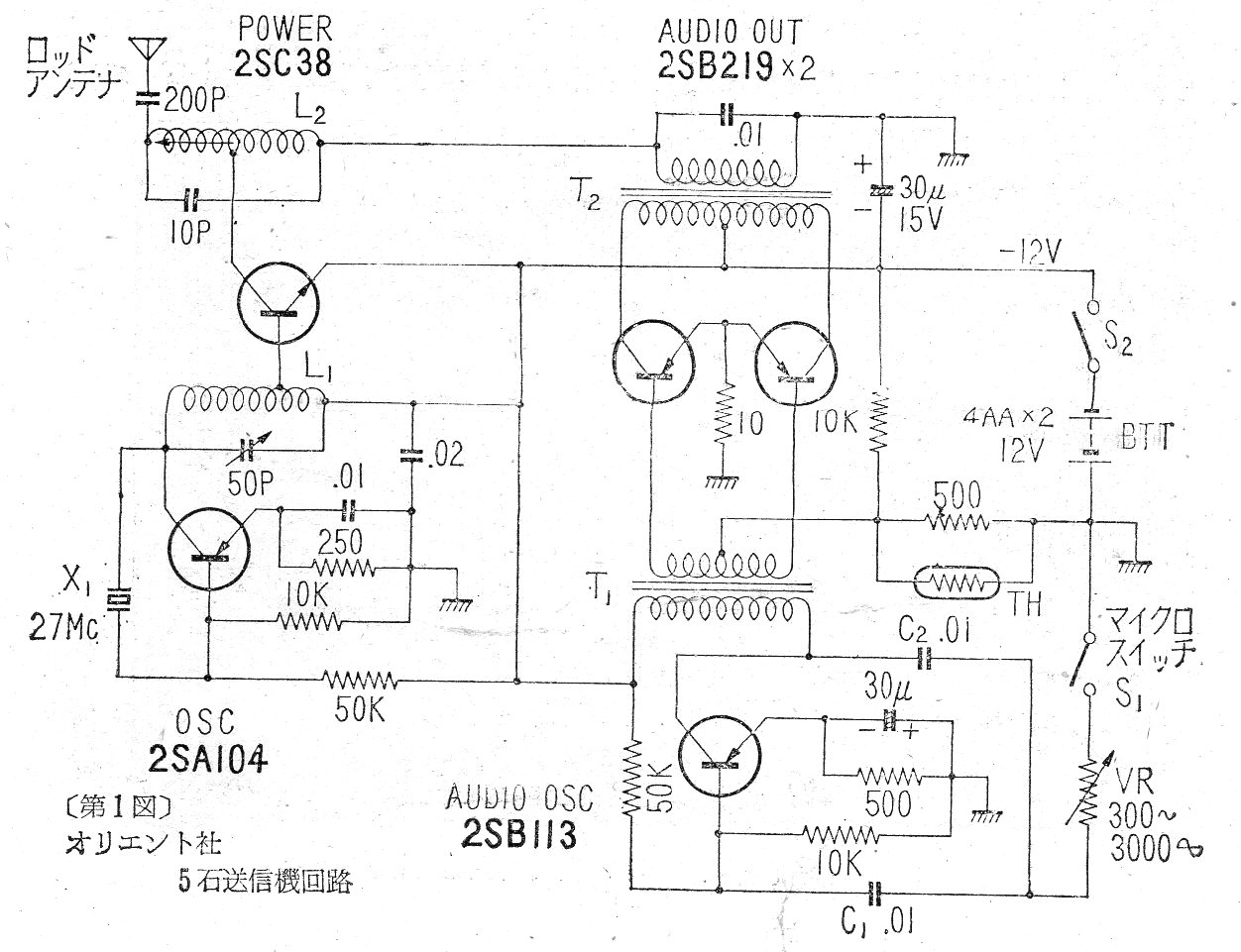 Este es un circuito de 1962, encontrado en una publicación japonesa de la época. Los transistores son de germanio de la época y la frecuencia de operación de 27 MHz es dada por el cristal. El circuito se utilizaba con aeromodelos.