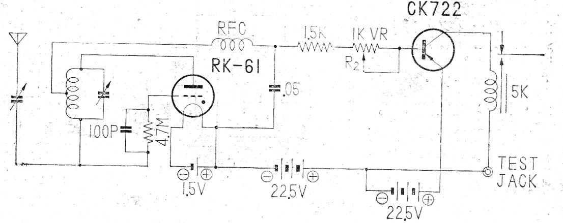 Este receptor utiliza una válvula y un transistor para un sistema monocanal. El circuito es de una documentación de 1962 siendo la válvula el componente crítico del proyecto. La frecuencia de funcionamiento es de 27 MHz.