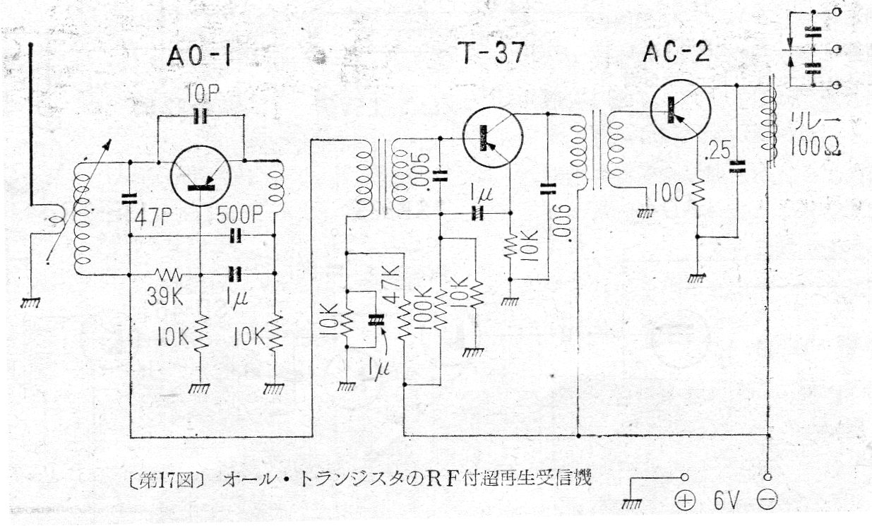 Este circuito es de una publicación japonesa de 1962. Los transistores son de germanio de tipos comunes en la época, pero que ya no se pueden encontrar. El circuito opera en 27 MHz en un sistema monocanal accionando un relé.