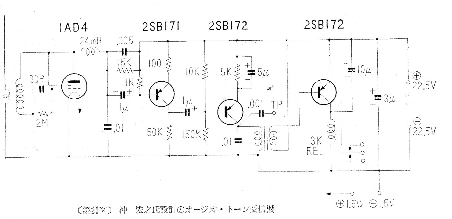 Este circuito es de una publicación japonesa de 1962. Utiliza una válvula triodo y transistores de la época, componentes poco comunes actualmente. El circuito es alimentado por una batería de 22,5 V para el sector principal y 1,5 V para el filamento de la válvula. El rango de operación es de 27 MHz.