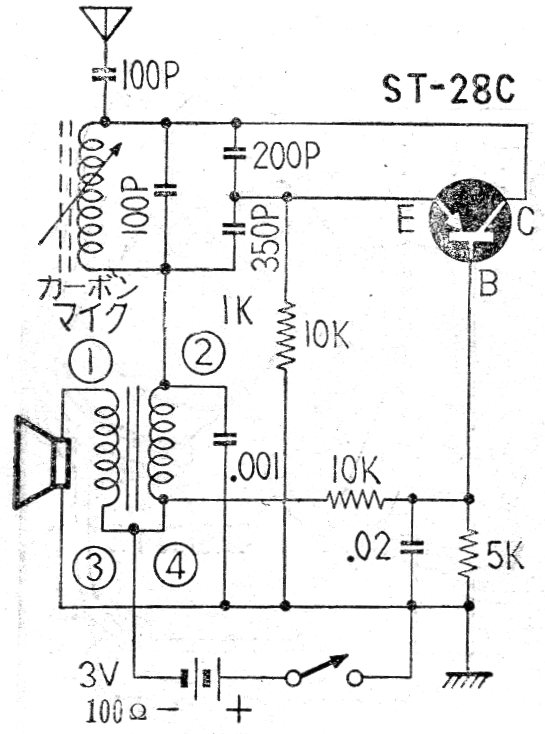 Este circuito es de una publicación japonesa antigua. Los transistores son de germanio y la bobina consiste en 80 a 100 espiras de hilo 28 o cerca de un bastón de ferrita. La antena puede tener de 40 cm a 1 metro y el alcance es de sólo unos metros.