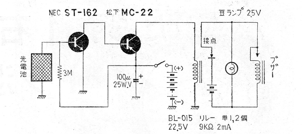 Centralizada en el blanco tenemos una fotocélula que al recibir el pulso del arma acciona un relé que tanto puede disparar un buzzer como una lámpara indicadora. El circuito es de una publicación japonesa de 1969 y el arma se describe en CIR11554. El sensor puede ser una fotocélula común.
