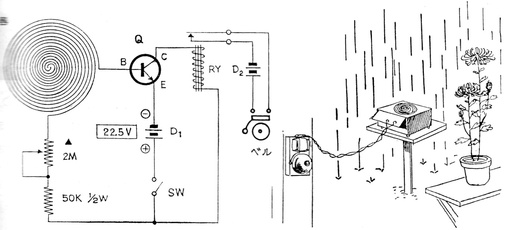 Este interesante circuito fue encontrado en una revista japonesa de 1968. Puede ser implementado con transistores actuales de mayor ganancia o Darlingtons y un relé de 6 o 12 V, disminuyendo así la tensión de alimentación. Observe el sensor utilizado.
