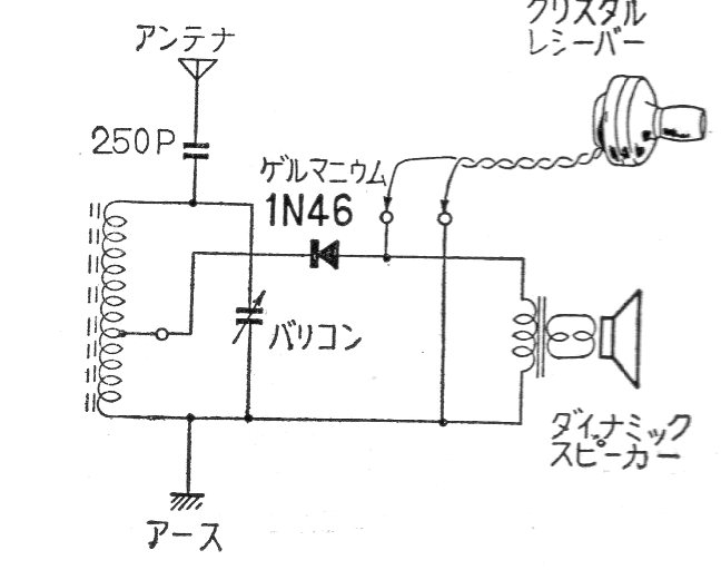 Este circuito simple puede proporcionar escucha tanto en un pequeño altavoz como en un auricular. Encontramos en una documentación japonesa de 1967. La bobina consta de 40 y 60 espiras de hilo 28 a 32 en un bastón de ferrita y la antena debe ser externa larga.